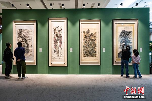 4月13日,市民在北京榮寶齋欣賞在此舉辦的“南張北齊——張大千齊白石書畫藝術特展”。本次特展精選張大千與齊白石一生早、中、晚三個時期,近五十件(組)佳作,完整地涵蓋了兩位世紀巨匠各個時期的創(chuàng)作面貌。圖為觀眾參觀齊白石《梅石圖》《荔枝圖》(左一、左二)和張大千《夏山高隱圖》《峨眉接引殿》(右二、右一)。中新社記者 侯宇 攝