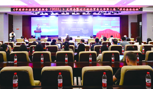 日前,對(duì)外經(jīng)濟(jì)貿(mào)易大學(xué)涉外法治研究院和法學(xué)院共同舉辦的《中國(guó)涉外法治發(fā)展報(bào)告(2022)》發(fā)布會(huì)暨對(duì)外經(jīng)濟(jì)貿(mào)易大學(xué)第三屆“涉外法治論壇”舉行。本年度報(bào)告共包含11個(gè)專(zhuān)題,從參與全球治理、立法、執(zhí)法、司法、法律服務(wù)和法學(xué)研究等方面展現(xiàn)了我國(guó)涉外法治發(fā)展的成績(jī)、問(wèn)題和建議。來(lái)自政府部門(mén)、實(shí)務(wù)機(jī)構(gòu)和校內(nèi)外專(zhuān)家學(xué)者代表出席本次發(fā)布會(huì)。