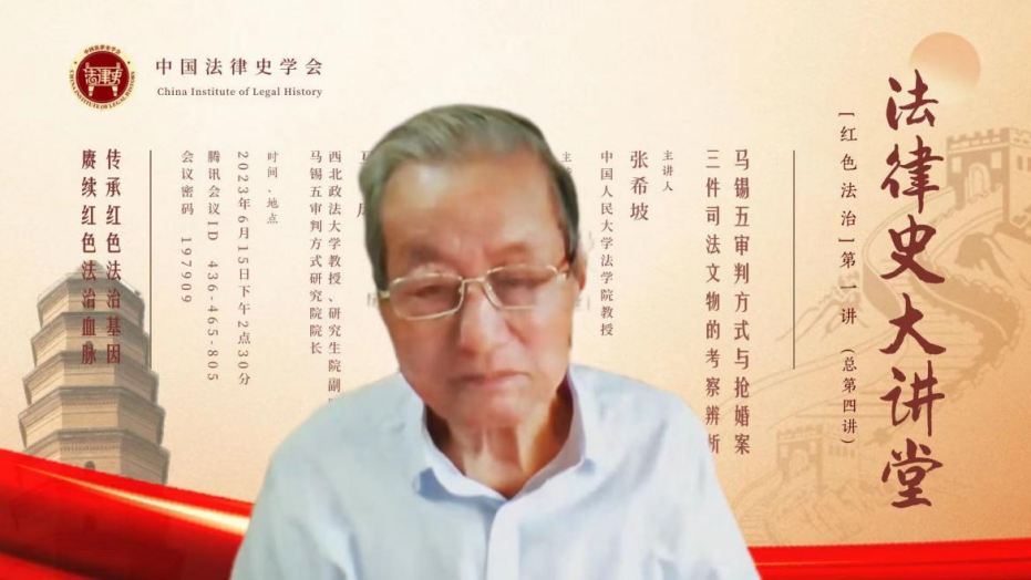 6月15日,由中國法律史學(xué)會主辦的法律史大講堂“紅色法治”系列第一講(總第四講)舉行。中國人民大學(xué)法學(xué)院張希坡教授以“馬錫五審判方式與‘搶婚案’三件司法文物的考察辨析”為題主講,重點講述了兩方面內(nèi)容:其一,馬錫五簡歷及馬錫五審判方式產(chǎn)生的社會歷史根源;其二,關(guān)于“搶婚案”的三件司法文物的考察辨析。講座由中國人民大學(xué)法學(xué)院馬小紅教授主持,黑龍江大學(xué)法學(xué)院孫光妍教授、西北政法大學(xué)馬錫五審判方式研究院馬成教授作為與談嘉賓發(fā)言。
