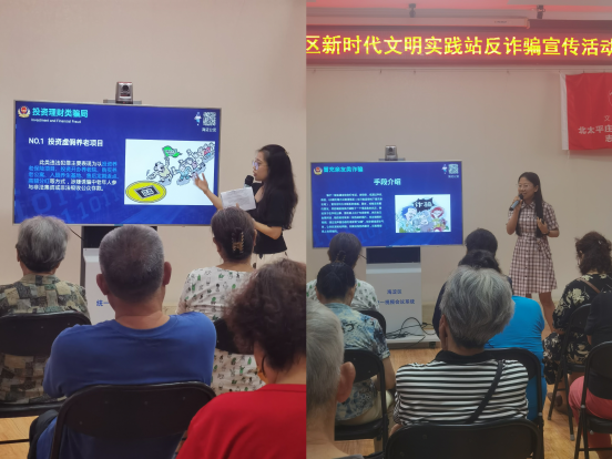 宣講團(tuán)成員王舒琦、李成秀在北京市海淀區(qū)北太平莊街道明光北里社區(qū)的社區(qū)活動(dòng)中為老年人們進(jìn)行了防范養(yǎng)老詐騙宣傳。兩位同學(xué)結(jié)合類型分析與實(shí)務(wù)案例,重點(diǎn)介紹了誘導(dǎo)消費(fèi)類、投資理財(cái)類、養(yǎng)老保險(xiǎn)類等典型騙局的詐騙方式,分享了針對(duì)性的防范路徑與預(yù)防措施,并給出了具體的防范建議。兩位同學(xué)的講解幫助老年人充分認(rèn)識(shí)到防范詐騙的重要性,樹(shù)立了反詐意識(shí),了解了防詐知識(shí)。