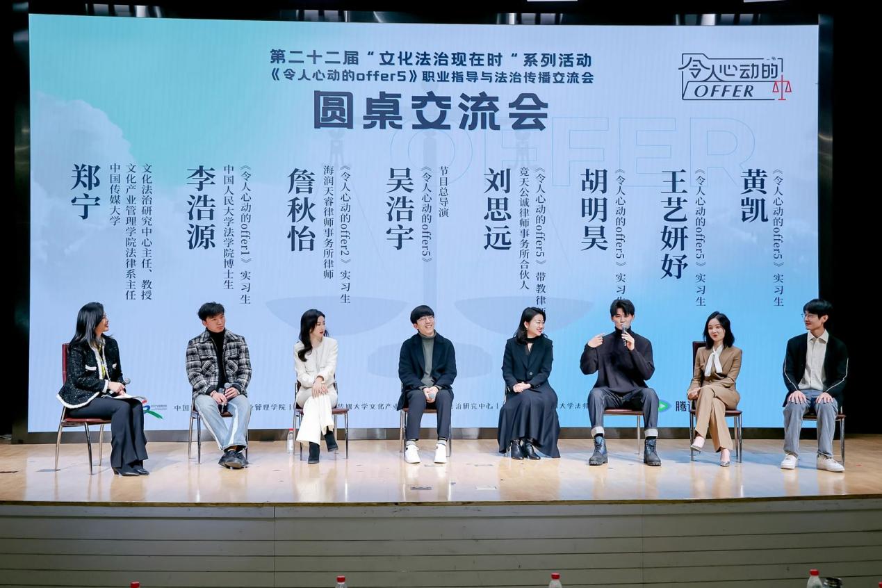圓桌交流環(huán)節(jié)由中國傳媒大學(xué)文化產(chǎn)業(yè)管理學(xué)院法律系主任、文化法治研究中心主任鄭寧主持。與會嘉賓圍繞參加節(jié)目的收獲、個人選擇和成長的心路歷程、如何提升職場競爭力、對在校生的求職建議以及如何打造職場觀察類綜藝節(jié)目等話題進行了交流分享,就《令人心動的offer5》的社會價值、求職經(jīng)驗、如何提升自身能力等話題為同學(xué)們答疑解惑,并提出務(wù)實建議。