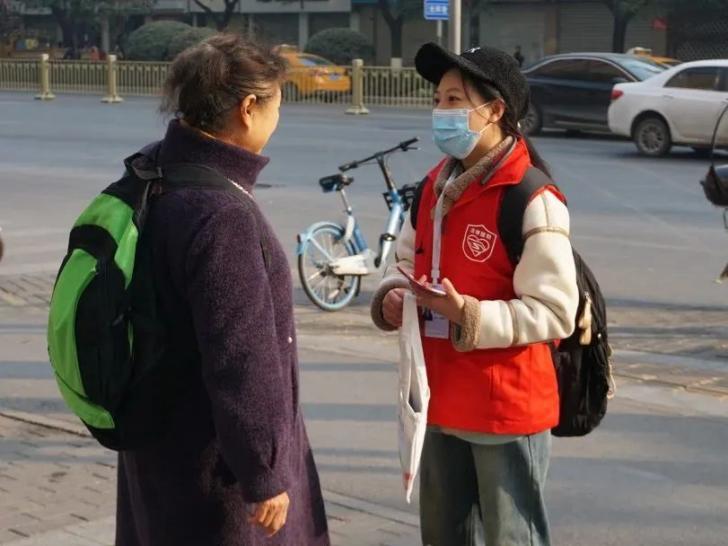 在西安市法律援助中心服務(wù)驛站,法律服務(wù)中心志愿者們幫助服務(wù)驛站向周邊群眾分發(fā)法律宣傳資料,普及驛站的服務(wù)地點(diǎn)和功能,同時(shí)耐心地講解法律知識(shí)。