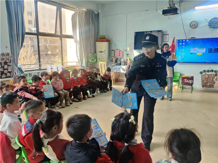 (1月15日下午,鎮(zhèn)海派出所社區(qū)民警到劍橋雙語幼兒園開展“小手拉大手”安全教育宣傳活動)