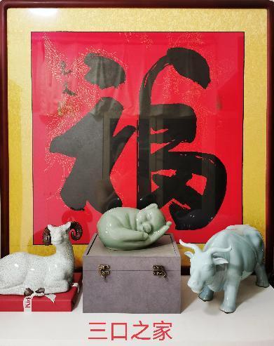 毫無(wú)疑問,正是這件作品隱含的濃烈親情元素和快樂因子,深深吸引并打動(dòng)了我,才最終成全了這筆交易,甚至讓我一不做二不休,干脆還買下了自己和夫人的生肖作品——羊和牛。返京后,我們將這三件清一色吃素的屬相工藝品,和家中原有的一幅大紅“?!弊?jǐn)[在一起,便組合出一幅別有情趣的“和諧家園風(fēng)景圖”:幸福一家人、快樂一家親。