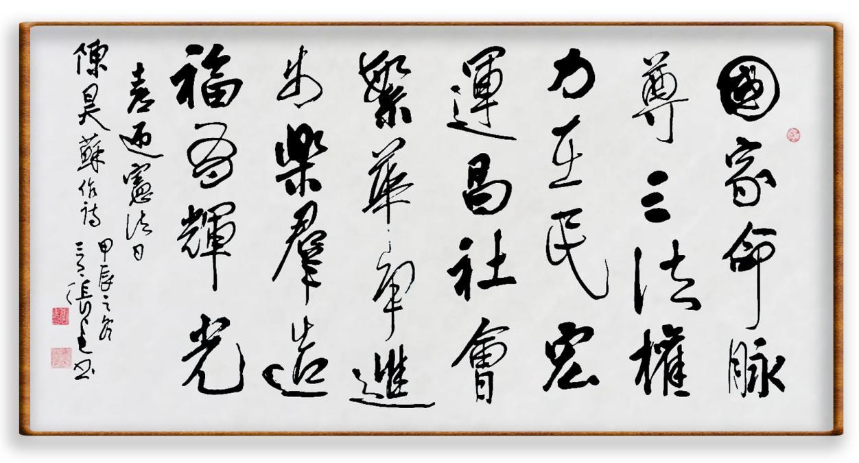 12月4日是第十一個國家憲法日。當(dāng)天,由法制日報社、中國人民解放軍儀仗司禮大隊主辦的“‘書·法’系列活動走進中國人民解放軍儀仗司禮大隊暨‘書·法’系列叢書書法作品集首發(fā)活動”在北京舉行?;顒拥玫街袊嗣駥ν庥押脜f(xié)會原會長陳昊蘇的熱情支持,陳會長以《喜迎憲法日》為題賦詩二首,并在詩的開頭寫到:“在國家憲法日舉行‘書·法’有關(guān)活動,意義十分重大。我謹(jǐn)寄上詩二首,表示熱烈祝賀?!?/p>