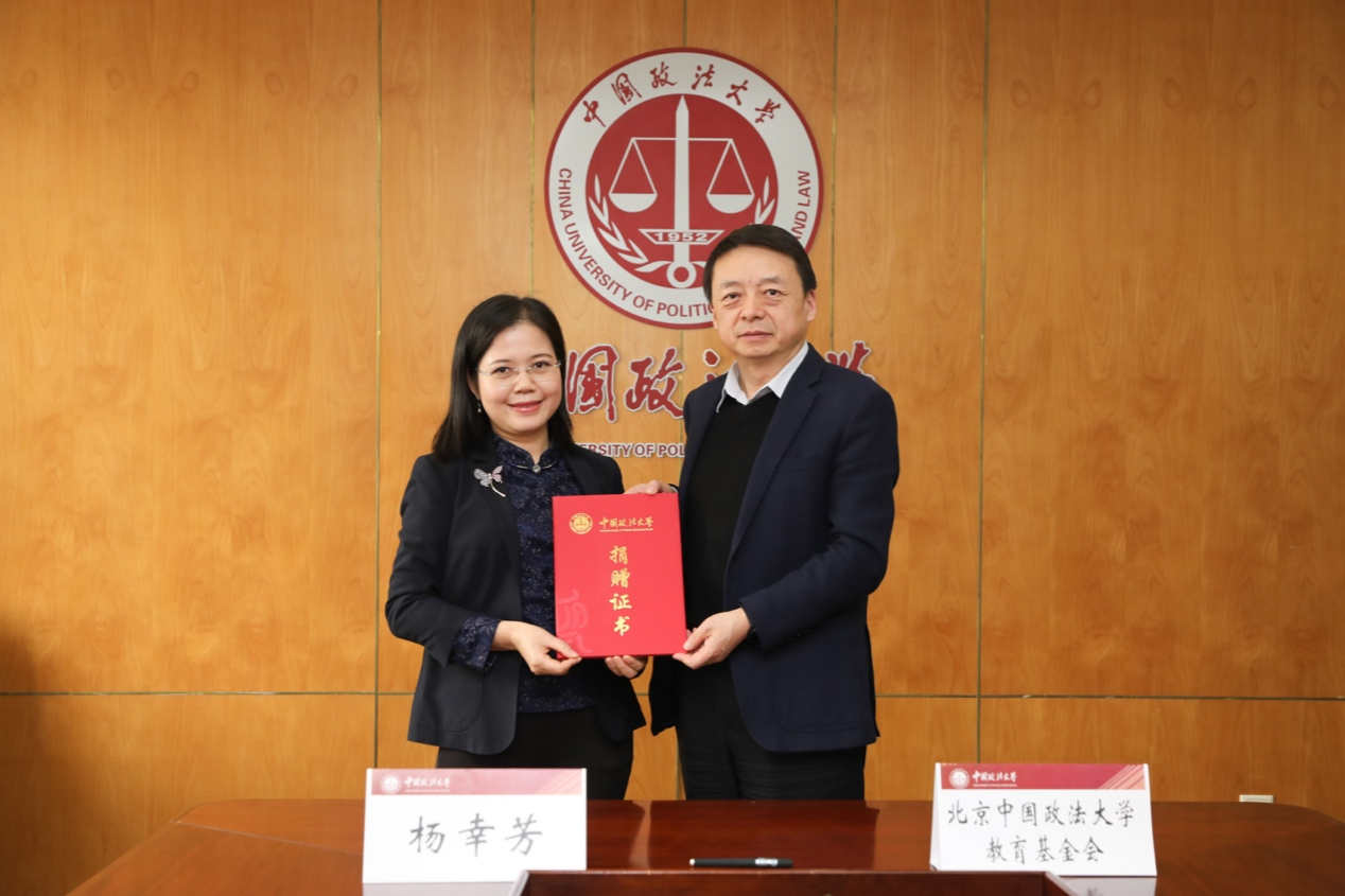 盧春龍代表中國政法大學(xué)和楊幸芳簽署捐贈(zèng)協(xié)議,馬懷德代表中國政法大學(xué)向楊幸芳頒發(fā)捐贈(zèng)證書。