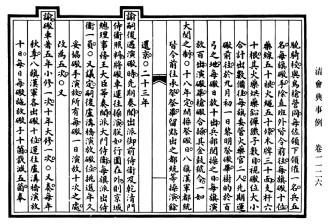 “事例”原指先前存在的成例。在中國(guó)古代,事例對(duì)后發(fā)類案之處置,多具指導(dǎo)意義。西晉時(shí),楊駿以謀反之罪見(jiàn)誅,其弟楊珧雖陳情自告仍受牽連。“當(dāng)時(shí)皆謂宜為申理,合依鐘繇事例”,時(shí)人援引鐘繇免于鐘會(huì)之誅事,欲援救楊珧。逮至明代,“事例”已表現(xiàn)出與會(huì)典的密切聯(lián)系?!度f(wàn)歷會(huì)典》載,“其近年六部等衙門見(jiàn)行事例,各令選委司屬官,遵照體例,分類編集”。洎乎清代,“會(huì)典事例”作為一種法律形式繼續(xù)發(fā)展?!犊滴鯐?huì)典》率先厘定“事例”的類型。乾隆時(shí),認(rèn)為“夫例可通,典不可變”,典與例當(dāng)分離。遂在制定《大清會(huì)典》之余,另編《大清會(huì)典則例》180卷。嘉慶朝在編纂《大清會(huì)典》之外,又有《大清會(huì)典事例》920卷、《欽定大清會(huì)典圖》132卷。至此,“會(huì)典事例”以一種法律形式獨(dú)立于“會(huì)典”存在。