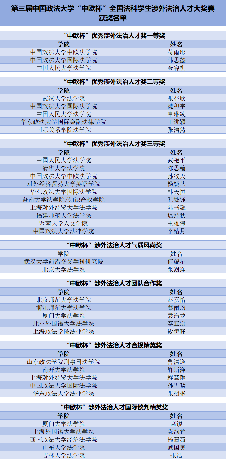 經(jīng)過激烈角逐,最終來自全國28所法學(xué)院系的35名同學(xué)脫穎而出。復(fù)賽共評選出:“中歐杯”優(yōu)秀涉外法治人才一等獎3名、二等獎5名、三等獎10名,“涉外法治人才氣質(zhì)風尚獎”2名,“涉外法治人才團隊合作獎”5名,“涉外法治人才合規(guī)精英獎”5名,“涉外法治人才國際談判精英獎”5名。