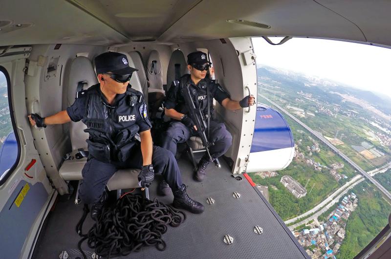 為進一步完善“水、陸、空”立體化治安防控格局,廣東省廣州市警方專門成立警務飛行巡邏專業(yè)隊伍,通過直升飛機搭載特警力量開展空中巡邏防控,與地面、水上巡邏防控力量聯(lián)勤聯(lián)動。圖為4月9日,廣州特警使用警用直升機開展“地上+空中”巡邏防控?! ?/p>