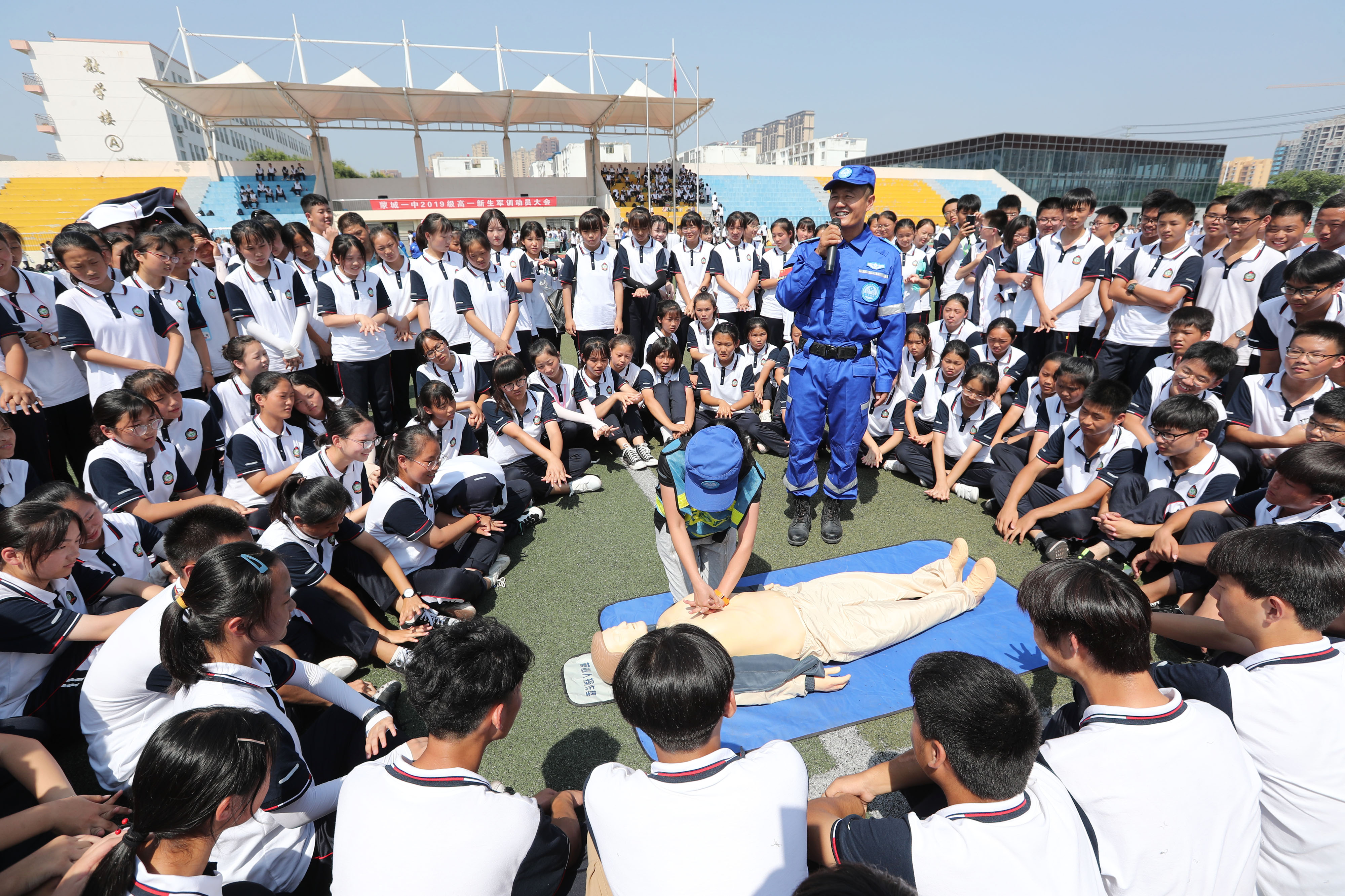 8月29日,安徽省蒙城縣第一中學操場,志愿者向高一新生演示介紹心腹復蘇急救要領。