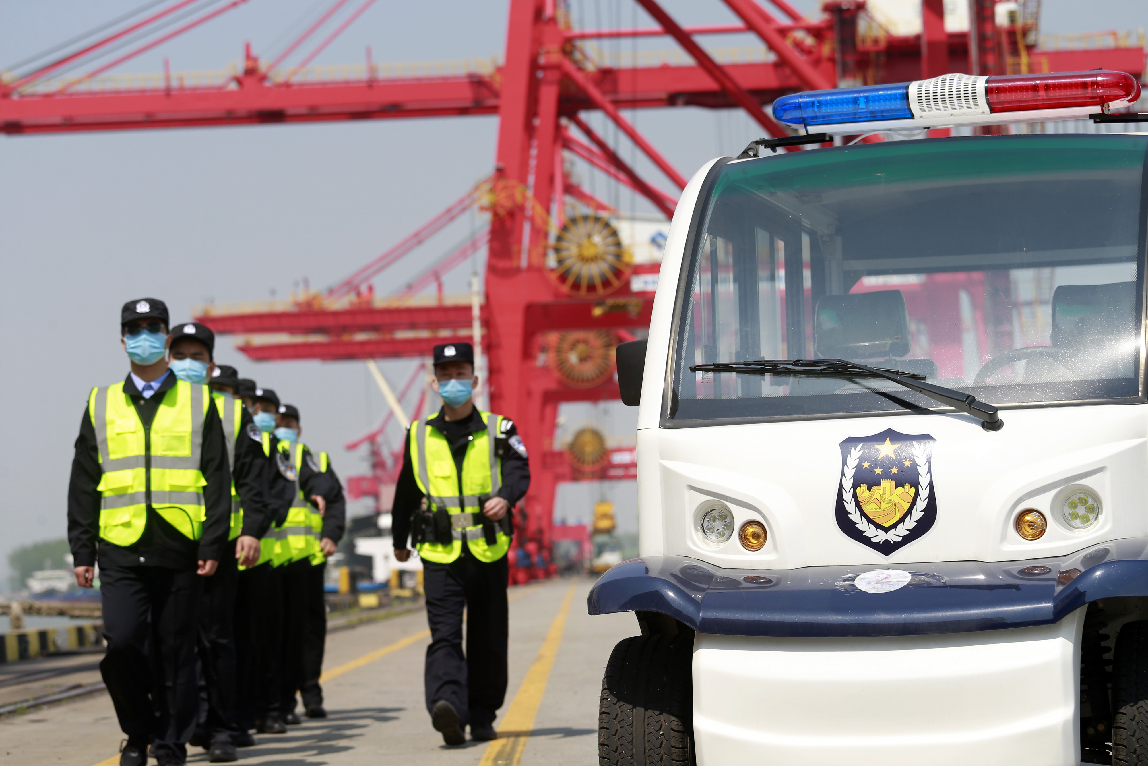 4月27日,在南京港出入境邊檢站民警的帶領(lǐng)下,廣西籍輔警參與碼頭巡邏。