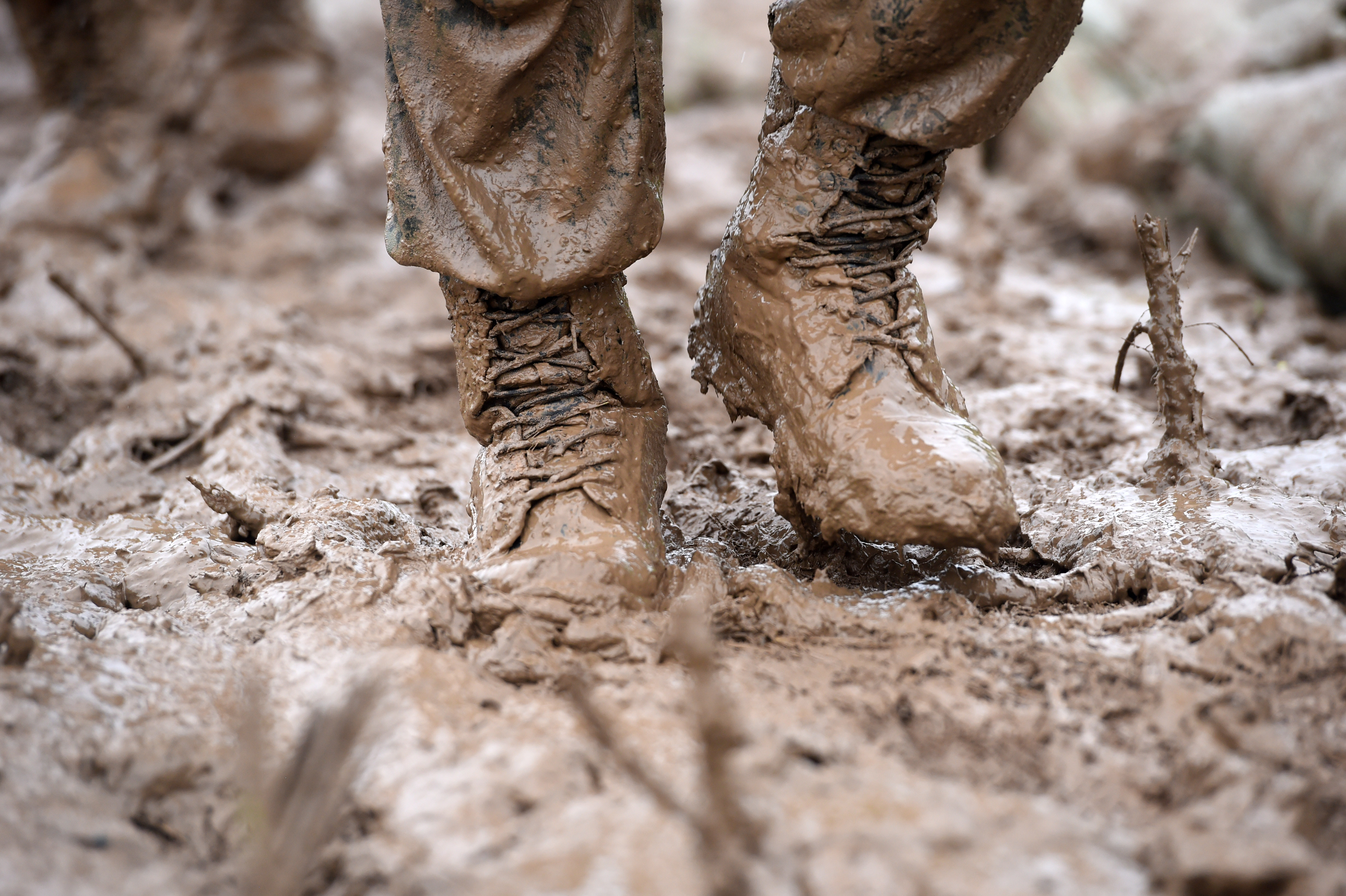 7月18日,武警安徽總隊(duì)馬鞍山支隊(duì)的戰(zhàn)士搬運(yùn)沙袋行走在和縣黃壩村的石跋河堤壩上,泥水裹滿(mǎn)褲腿和鞋。