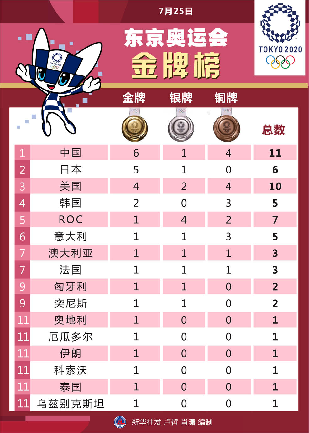 圖表:7月25日東京奧運會金牌榜