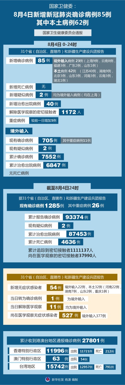 圖表:國家衛(wèi)健委:8月4日新增新冠肺炎確診病例85例 其中本土病例62例