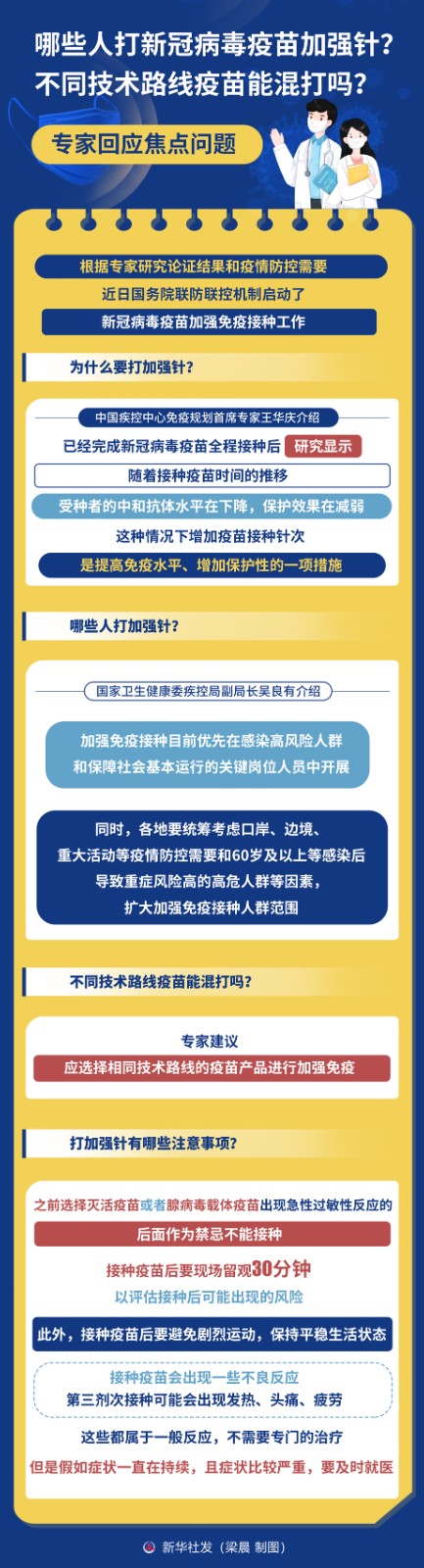 根據(jù)專家研究論證結(jié)果和疫情防控需要,近日國務(wù)院聯(lián)防聯(lián)控機(jī)制啟動了新冠病毒疫苗加強(qiáng)免疫接種工作。哪些人打新冠病毒疫苗加強(qiáng)針?不同技術(shù)路線疫苗能混打嗎?打加強(qiáng)針有哪些注意事項?國務(wù)院聯(lián)防聯(lián)控機(jī)制有關(guān)專家對焦點(diǎn)問題進(jìn)行回應(yīng)。