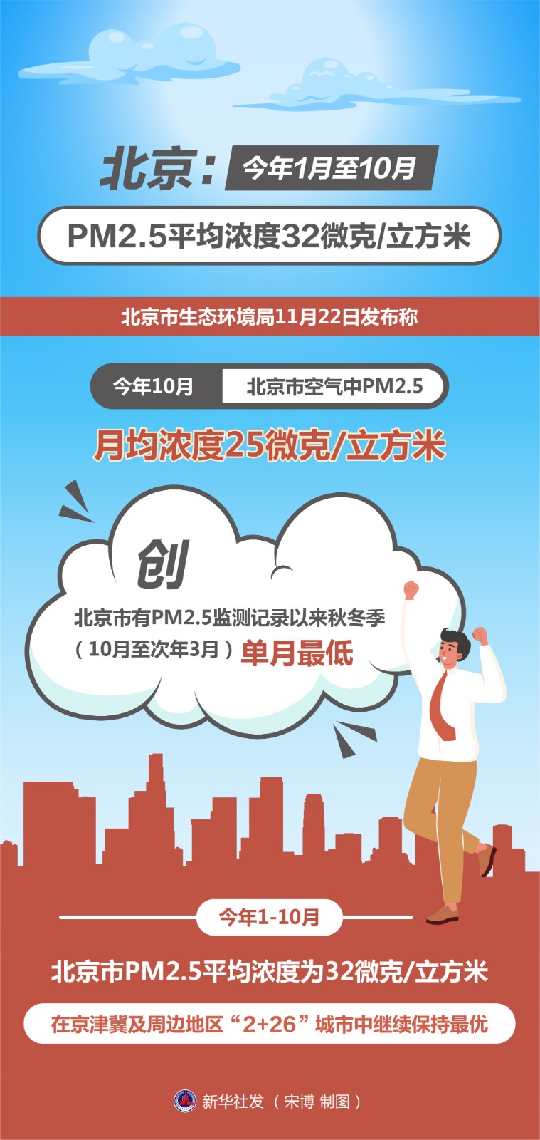 北京市生態(tài)環(huán)境局11月22日發(fā)布稱,今年10月,北京市空氣中PM2.5月均濃度25微克/立方米,創(chuàng)北京市有PM2.5監(jiān)測記錄以來秋冬季(10月至次年3月)單月最低。今年1-10月,北京市PM2.5平均濃度為32微克/立方米,在京津冀及周邊地區(qū)“2+26”城市中繼續(xù)保持最優(yōu)。