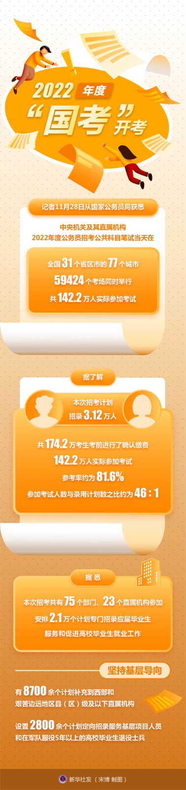 記者11月28日從國(guó)家公務(wù)員局獲悉,中央機(jī)關(guān)及其直屬機(jī)構(gòu)2022年度公務(wù)員招考公共科目筆試當(dāng)天在全國(guó)31個(gè)省區(qū)市的77個(gè)城市、59424個(gè)考場(chǎng)同時(shí)舉行,共142.2萬人實(shí)際參加考試。