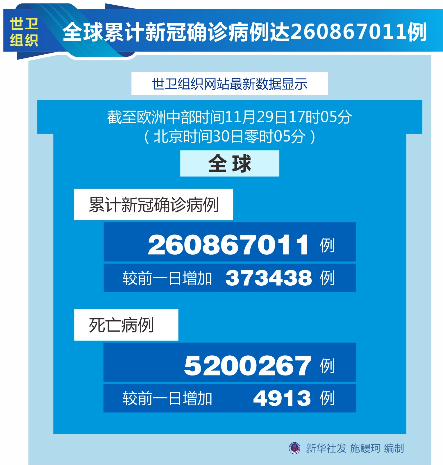 圖表:世衛(wèi)組織:全球累計(jì)新冠確診病例達(dá)260867011例
