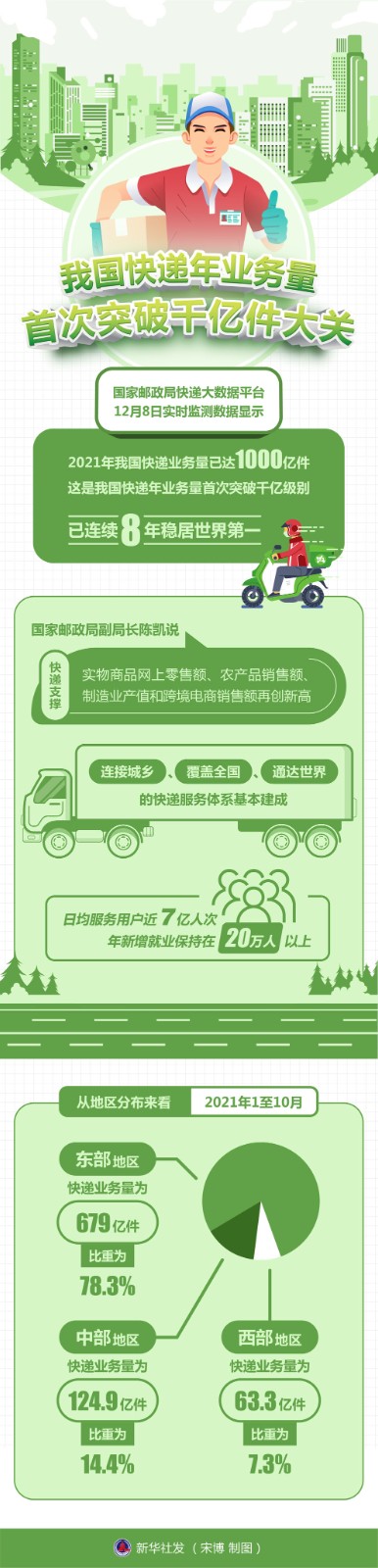 國(guó)家郵政局快遞大數(shù)據(jù)平臺(tái)12月8日實(shí)時(shí)監(jiān)測(cè)數(shù)據(jù)顯示,2021年我國(guó)快遞業(yè)務(wù)量已達(dá)1000億件,這是我國(guó)快遞年業(yè)務(wù)量首次突破千億級(jí)別,已連續(xù)8年穩(wěn)居世界第一。