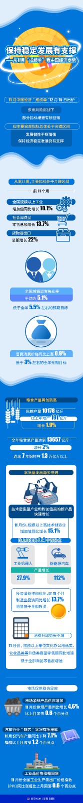 11月中國經(jīng)濟“成績單”12月15日出爐,多重風險挑戰(zhàn)下,部分指標增速有所回落,但主要宏觀指標總體處于合理區(qū)間,發(fā)展韌性不斷增強,保持經(jīng)濟穩(wěn)定發(fā)展仍有支撐。