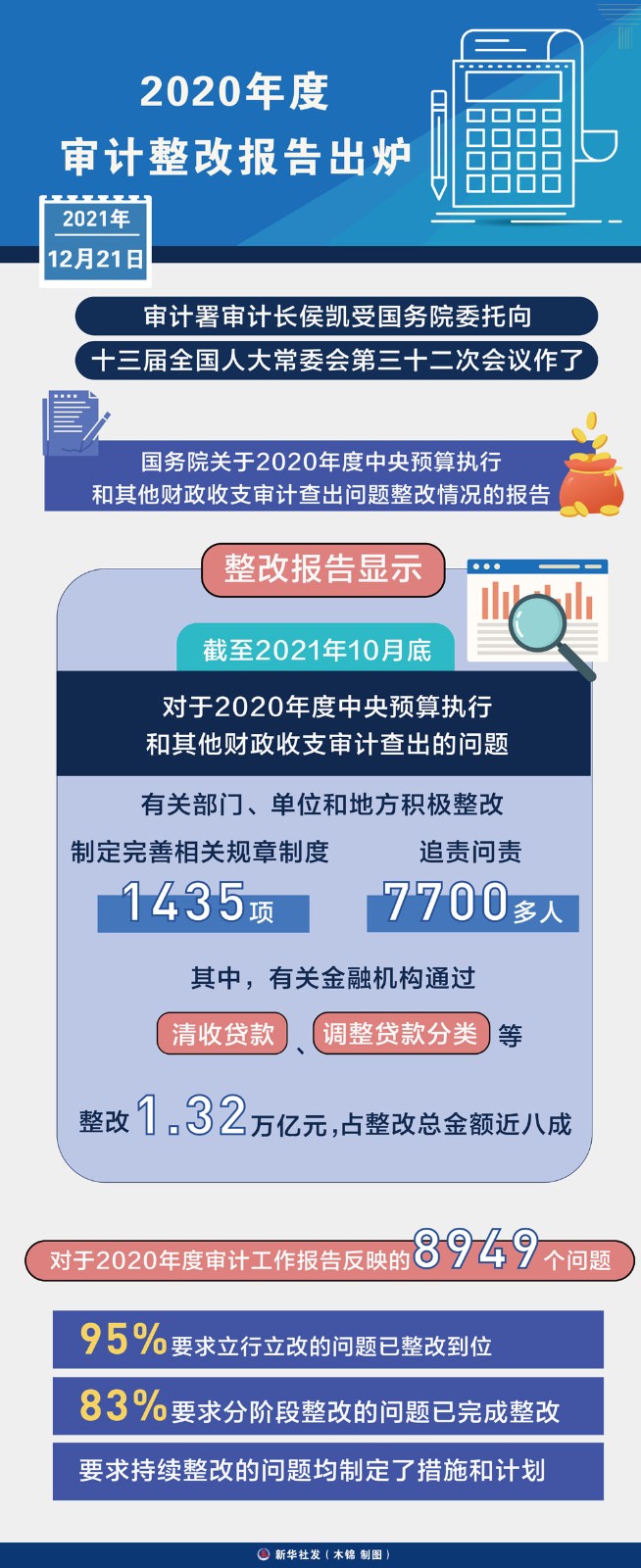 截至2021年10月底,對(duì)于2020年度中央預(yù)算執(zhí)行和其他財(cái)政收支審計(jì)查出的問(wèn)題,有關(guān)部門(mén)、單位和地方積極整改,制定完善相關(guān)規(guī)章制度1435項(xiàng),追責(zé)問(wèn)責(zé)7700多人,其中,有關(guān)金融機(jī)構(gòu)通過(guò)清收貸款、調(diào)整貸款分類等整改1.32萬(wàn)億元,占整改總金額近八成。
