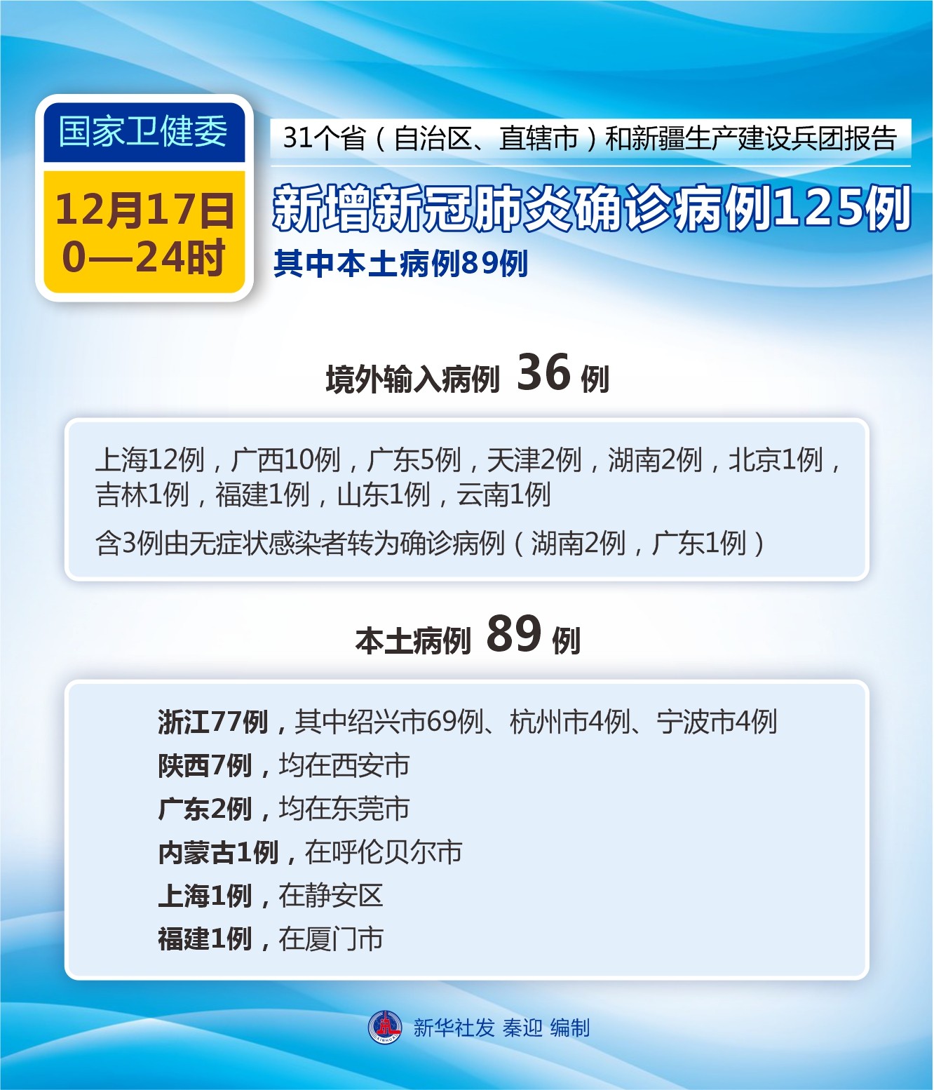 圖表:國家衛(wèi)健委:12月17日新增新冠肺炎確診病例125例 其中本土病例89例