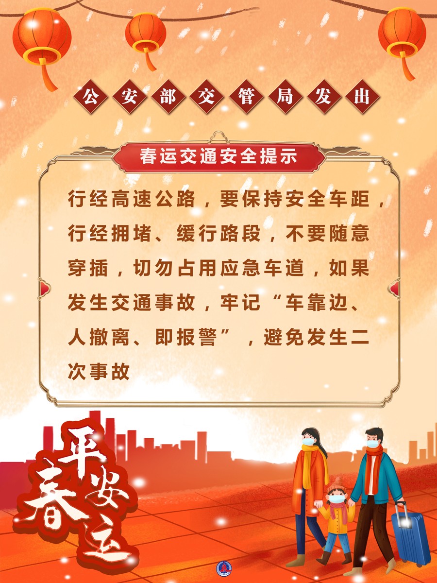 2022年春運于1月17日開始。公安部交管局發(fā)出春運交通安全提示:重點時段出行集中,低溫雨雪天氣多發(fā),需高度重視道路交通安全。