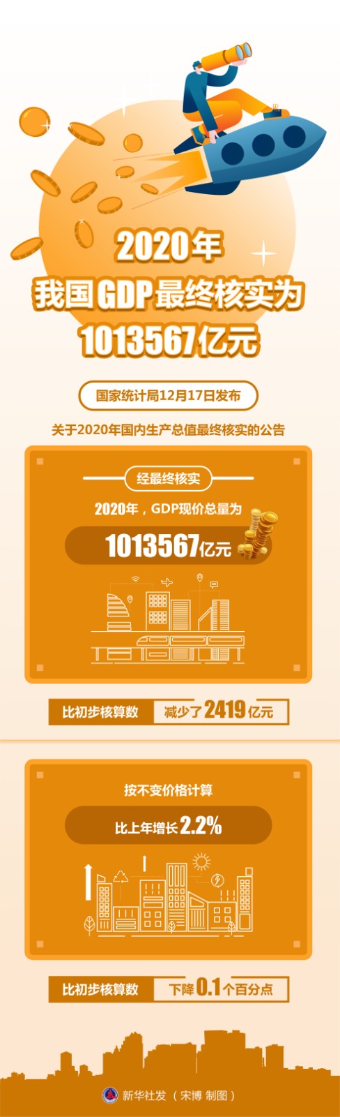 國家統(tǒng)計局12月17日發(fā)布關于2020年國內(nèi)生產(chǎn)總值最終核實的公告,經(jīng)最終核實,2020年,GDP現(xiàn)價總量為1013567億元,比初步核算數(shù)減少了2419億元。