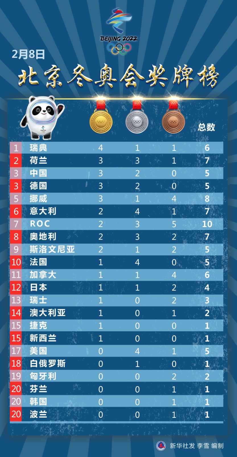 圖表:2月8日北京冬奧會(huì)獎(jiǎng)牌榜
