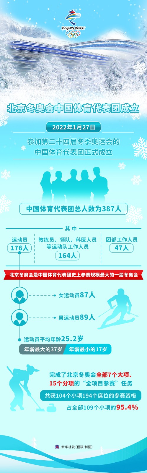 北京冬奧會中國體育代表團總人數為387人,其中運動員176人,教練員、領隊、科醫(yī)人員等運動隊工作人員164人,團部工作人員47人。北京冬奧會是中國體育代表團歷史上參賽規(guī)模最大的一屆冬奧會。