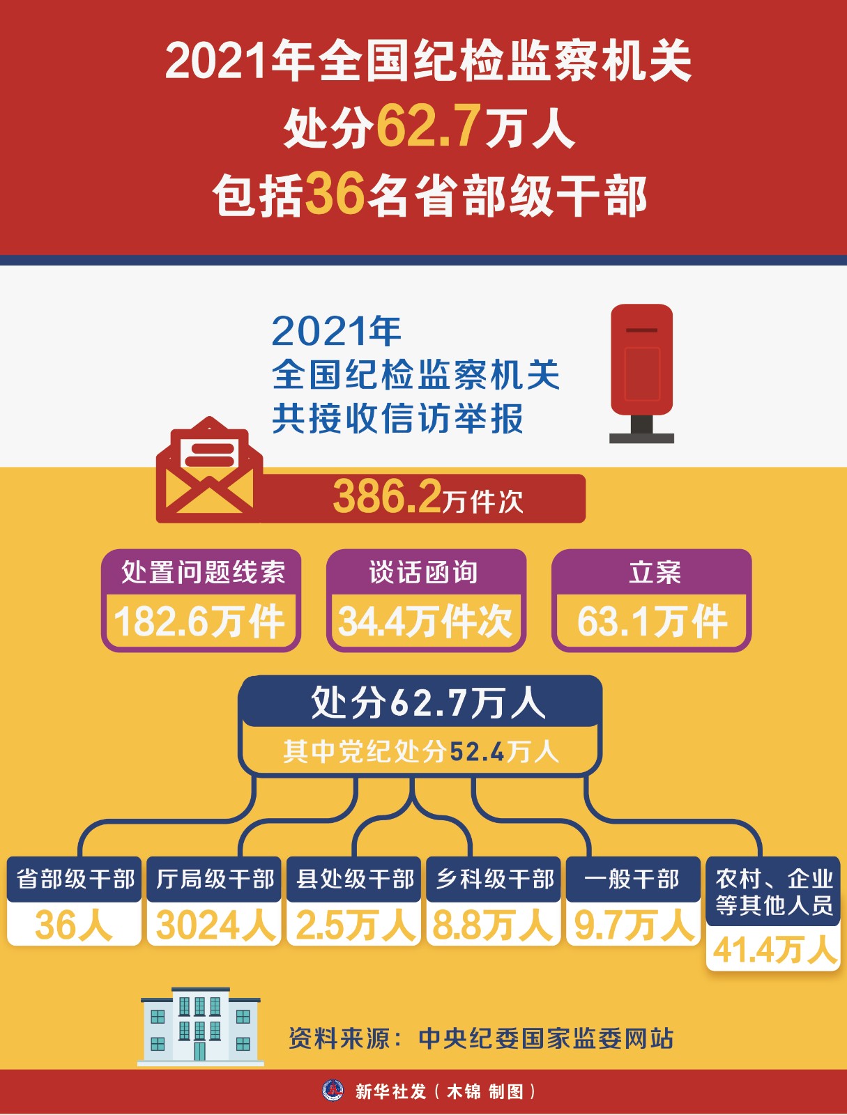 中央紀(jì)委國(guó)家監(jiān)委網(wǎng)站1月21日消息,中央紀(jì)委國(guó)家監(jiān)委通報(bào)2021年全國(guó)紀(jì)檢監(jiān)察機(jī)關(guān)監(jiān)督檢查審查調(diào)查情況。2021年,全國(guó)紀(jì)檢監(jiān)察機(jī)關(guān)共接收信訪舉報(bào)386.2萬(wàn)件次,立案63.1萬(wàn)件,處分62.7萬(wàn)人,包括省部級(jí)干部36人,廳局級(jí)干部3024人。