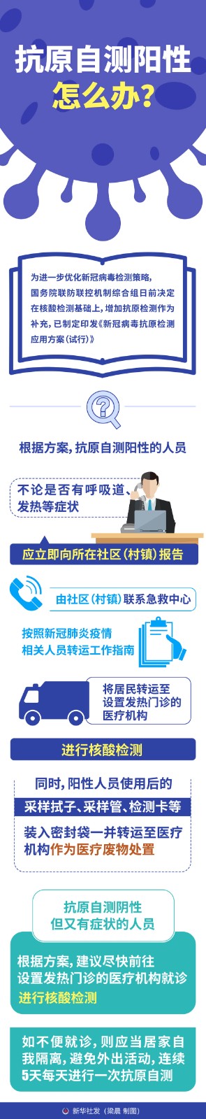 根據(jù)方案,抗原自測(cè)陽(yáng)性的人員,不論是否有呼吸道、發(fā)熱等癥狀,應(yīng)立即向所在社區(qū)(村鎮(zhèn))報(bào)告,由社區(qū)(村鎮(zhèn))聯(lián)系急救中心按照新冠肺炎疫情相關(guān)人員轉(zhuǎn)運(yùn)工作指南,將居民轉(zhuǎn)運(yùn)至設(shè)置發(fā)熱門診的醫(yī)療機(jī)構(gòu),進(jìn)行核酸檢測(cè)。