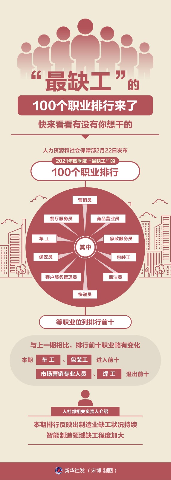 人力資源和社會保障部2月22日發(fā)布2021年四季度“最缺工”的100個職業(yè)排行,其中,營銷員、餐廳服務員、商品營業(yè)員、車工、家政服務員、保安員、包裝工、客戶服務管理員、保潔員、快遞員等職業(yè)位列排行前十。