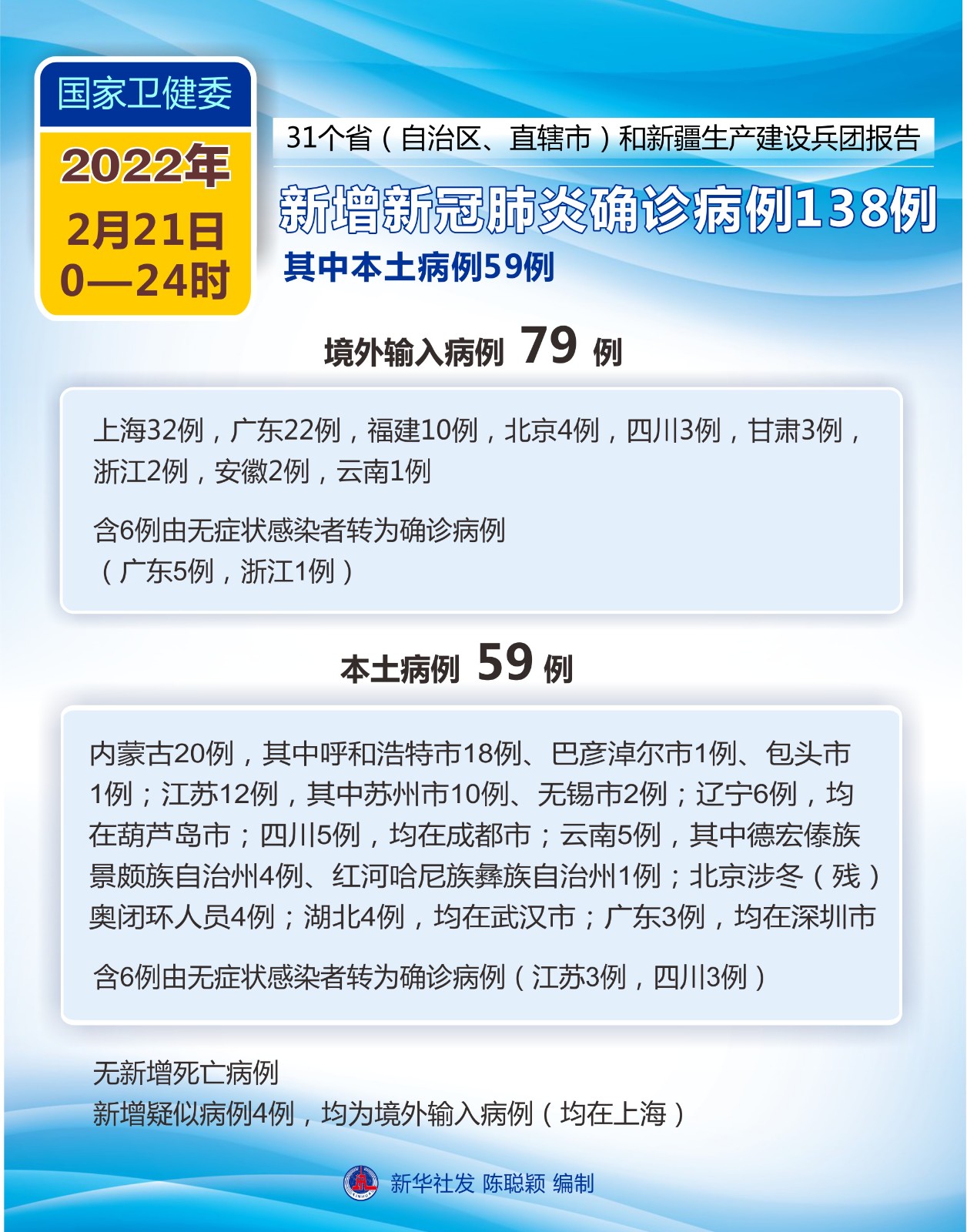 圖表:國(guó)家衛(wèi)健委:2月21日新增新冠肺炎確診病例138例 其中本土病例59例