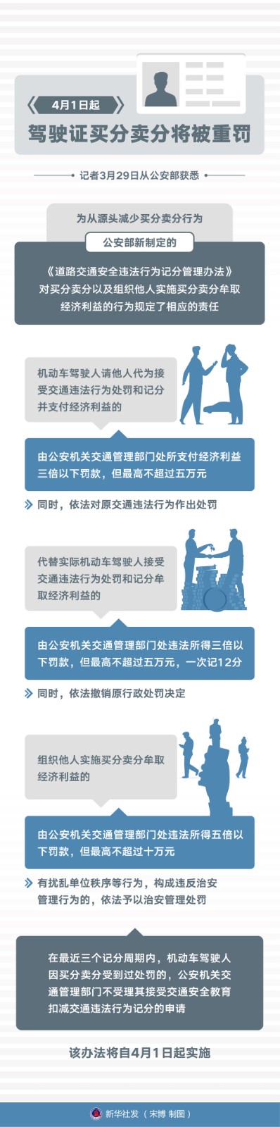 記者3月29日從公安部獲悉,為從源頭減少買分賣分行為,公安部新制定的《道路交通安全違法行為記分管理辦法》對買分賣分以及組織他人實施買分賣分牟取經(jīng)濟利益的行為規(guī)定了相應的責任。該辦法將自4月1日起實施。