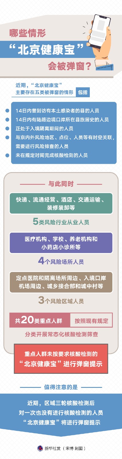 近期,“北京健康寶”主要存在五類被彈窗的情形,包括14日內(nèi)曾到訪有本土感染者的縣的人員;14日內(nèi)有陸路邊境口岸所在縣旅居史的人員;正處于入境隔離期間的人員;與京內(nèi)外風(fēng)險(xiǎn)地區(qū)、點(diǎn)位、人員等有時(shí)空關(guān)聯(lián),需要進(jìn)行風(fēng)險(xiǎn)排查的人員;未在規(guī)定時(shí)間完成核酸檢測的人員。