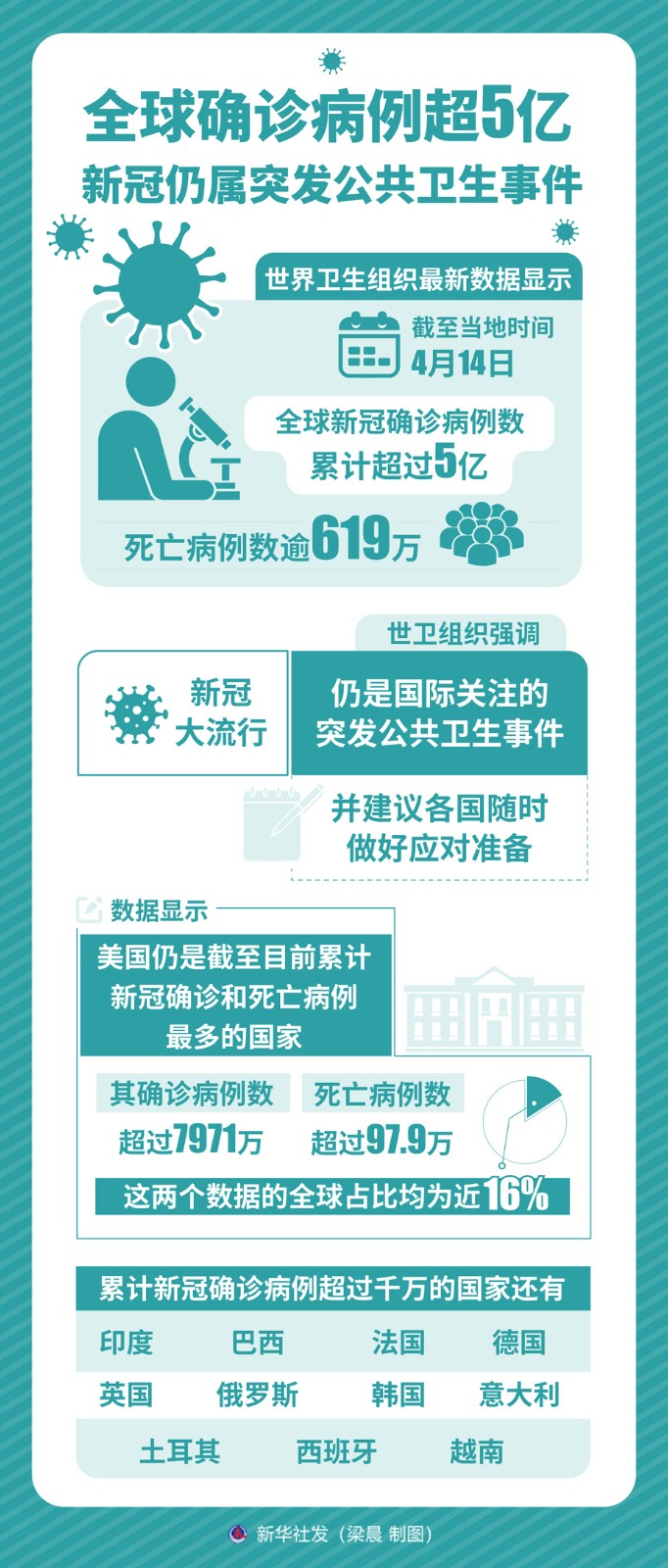 世界衛(wèi)生組織最新數(shù)據(jù)顯示,截至4月14日全球新冠確診病例數(shù)累計(jì)超過5億,死亡病例數(shù)逾619萬。雖然全球新增確診和死亡病例數(shù)近期持續(xù)下降,但世衛(wèi)組織強(qiáng)調(diào),新冠大流行仍是國際關(guān)注的突發(fā)公共衛(wèi)生事件,并建議各國隨時(shí)做好應(yīng)對(duì)準(zhǔn)備。