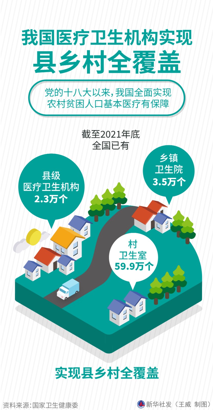 黨的十八大以來,我國全面實現(xiàn)農(nóng)村貧困人口基本醫(yī)療有保障。截至2021年底,全國已有縣級醫(yī)療衛(wèi)生機(jī)構(gòu)2.3萬個,鄉(xiāng)鎮(zhèn)衛(wèi)生院3.5萬個,村衛(wèi)生室59.9萬個,實現(xiàn)縣鄉(xiāng)村全覆蓋。