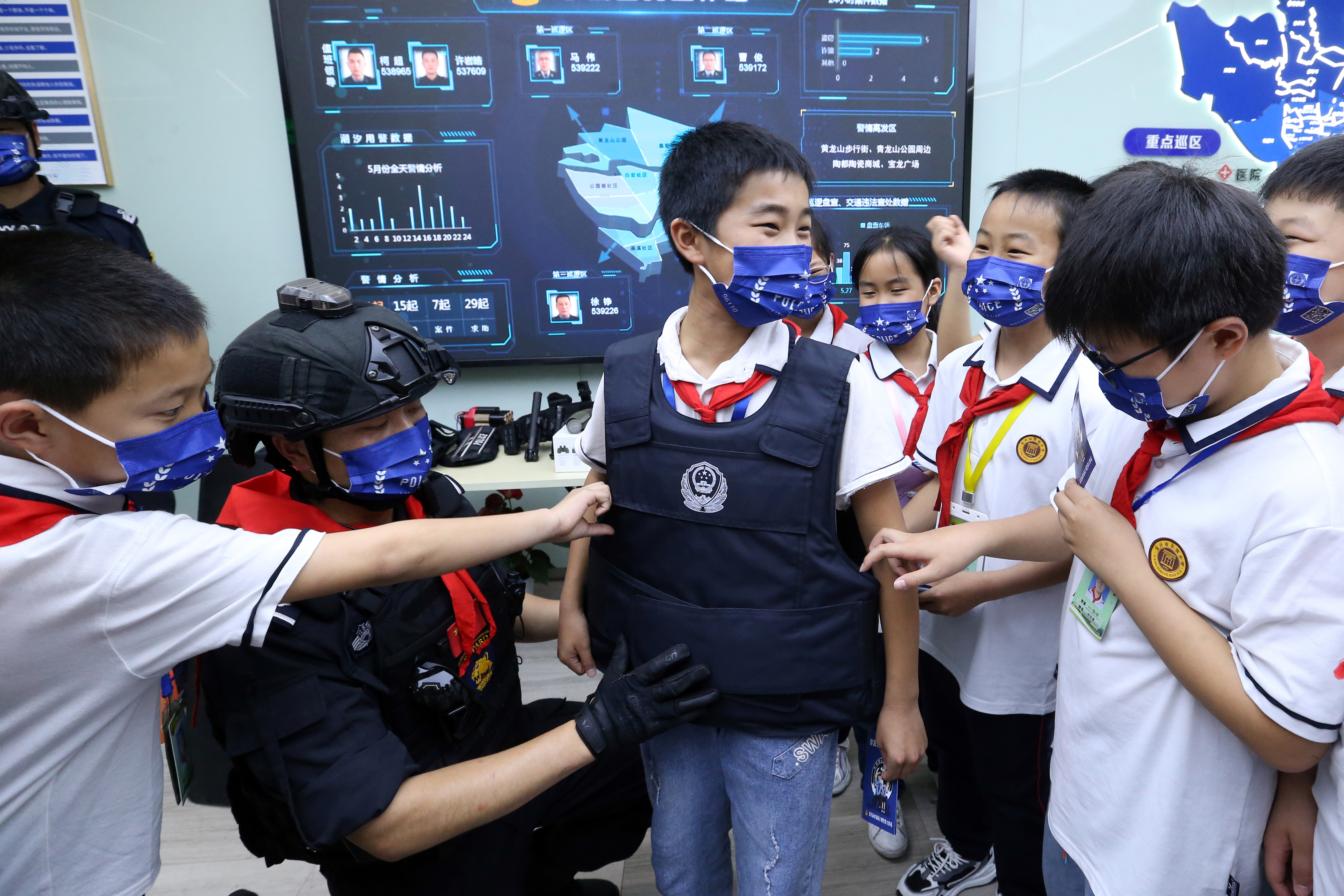 圖為5月30日,學(xué)生們?cè)诰瘎?wù)站體驗(yàn)警用裝備。