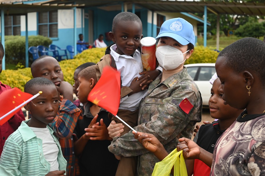 5月26日,在剛果(金)布卡武市國(guó)際SOS兒童村,中國(guó)第25批赴剛果(金)維和醫(yī)療分隊(duì)隊(duì)員開展愛心傳遞活動(dòng)。