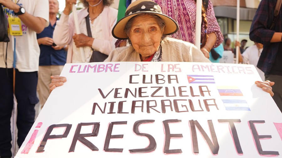6月10日,在美國加利福尼亞州洛杉磯,一名抗議者手持標語牌參加游行,抗議美國拒絕古巴、尼加拉瓜、委內瑞拉三國領導人參加美洲峰會。