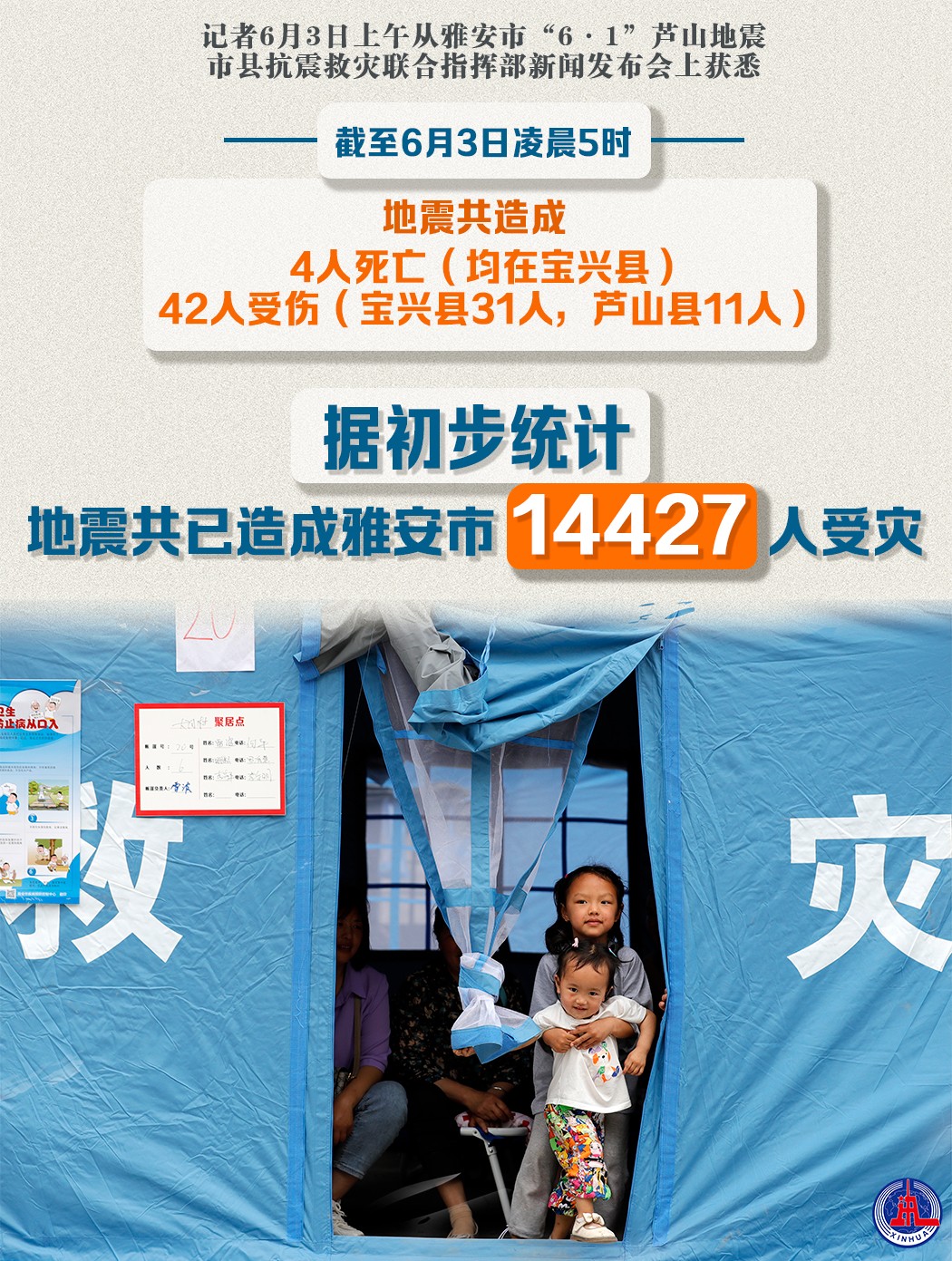 記者6月3日上午從雅安市“6·1”蘆山地震市縣抗震救災(zāi)聯(lián)合指揮部新聞發(fā)布會上獲悉,截至6月3日凌晨5時,地震共造成4人死亡(均在寶興縣)、42人受傷(寶興縣31人,蘆山縣11人)。據(jù)初步統(tǒng)計,地震共已造成雅安市14427人受災(zāi)。