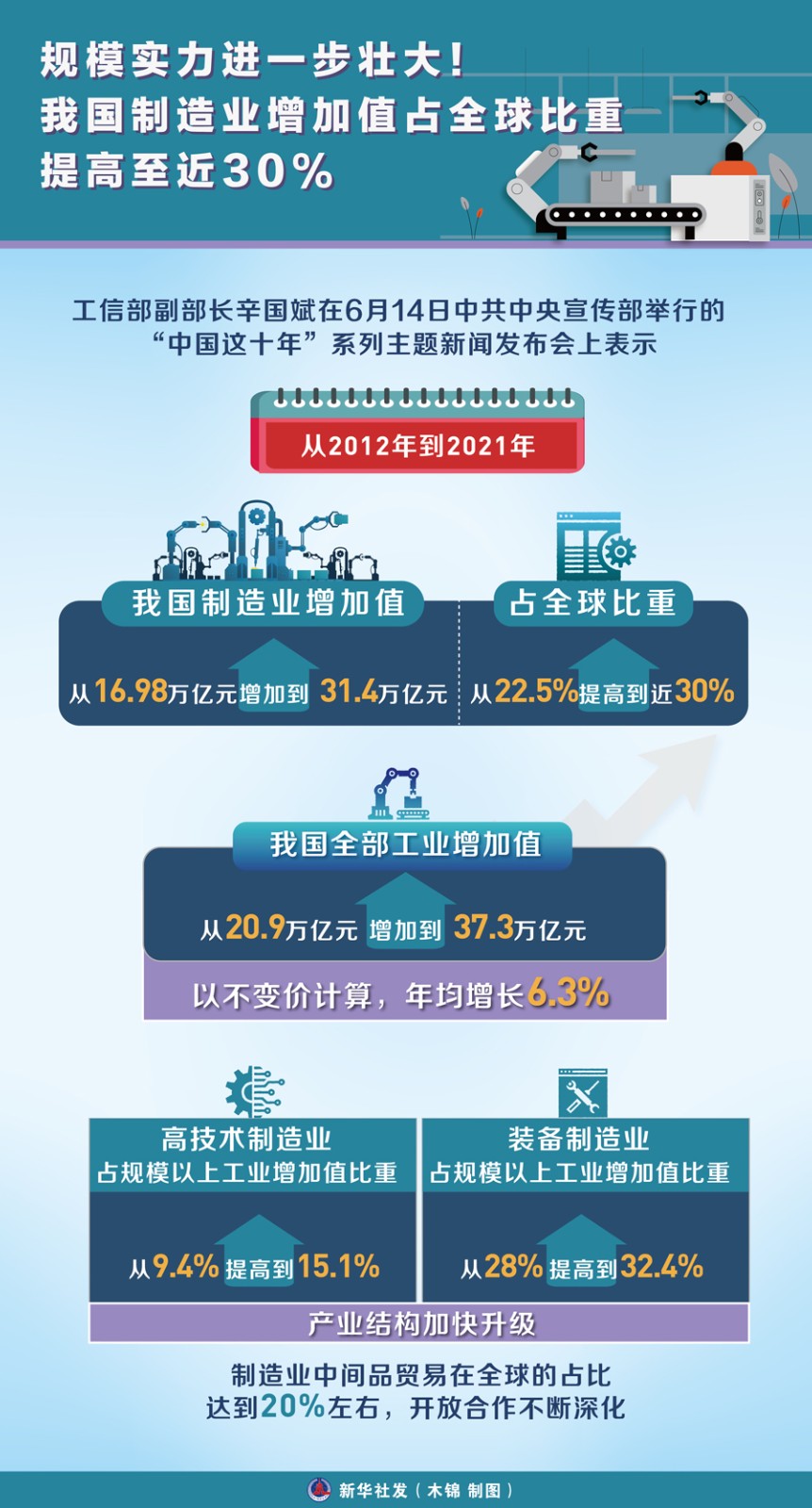 工信部副部長(zhǎng)辛國(guó)斌在6月14日中共中央宣傳部舉行的“中國(guó)這十年”系列主題新聞發(fā)布會(huì)上表示,從2012年到2021年,我國(guó)制造業(yè)增加值從16.98萬(wàn)億元增加到31.4萬(wàn)億元,占全球比重從22.5%提高到近30%。制造業(yè)規(guī)模實(shí)力進(jìn)一步壯大,夯實(shí)了經(jīng)濟(jì)發(fā)展的根基。