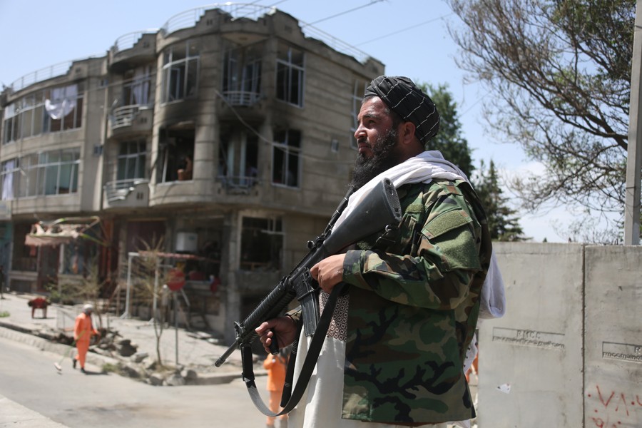 6月18日,安全人員在阿富汗喀布爾的襲擊現(xiàn)場附近警戒。