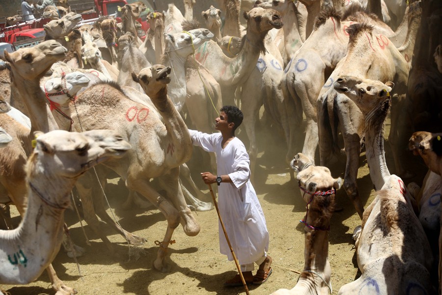 6月10日,商販在埃及開(kāi)羅附近的一處駱駝市場(chǎng)等待顧客。