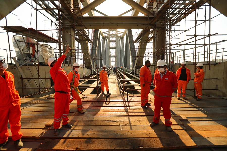 6月5日,在埃及伊斯梅利亞省,工人在蘇伊士運河鐵路橋舊橋改造升級項目施工現(xiàn)場作業(yè)。