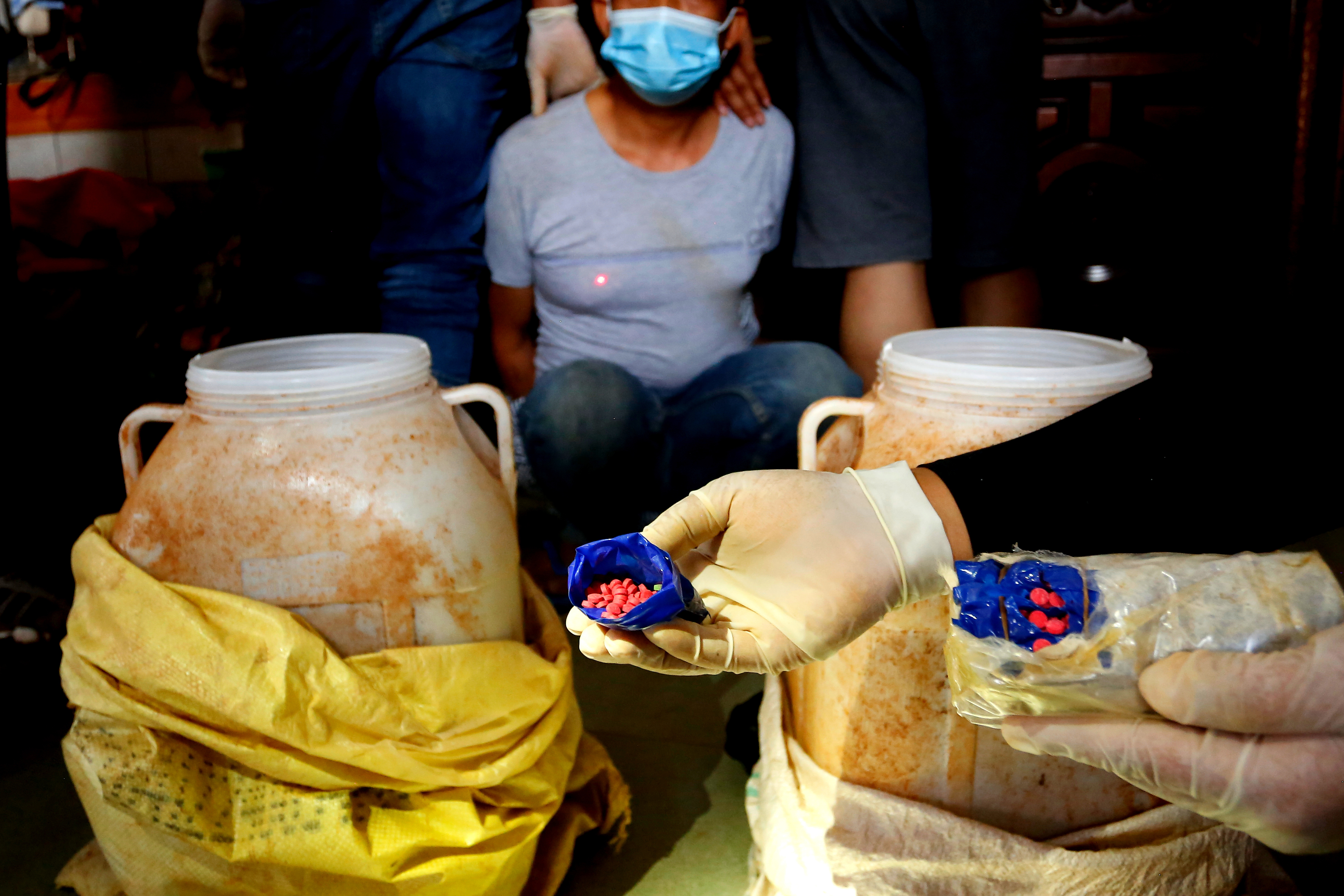 6月22日,在第35個國際禁毒日即將來臨之際,云南省德宏州在芒市公開銷毀查獲的海洛因、冰毒、鴉片、嗎啡、咖啡因等各類毒品4.87噸。圖為民警在對毒品進行稱量。
