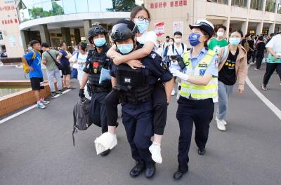 高考期間,江蘇省宜興市公安局多部門密切配合高效服務(wù),民警們盡職盡責值守在各考點,為考生營造安心、舒心、暖心的考試環(huán)境。圖為6月8日,執(zhí)勤民警協(xié)助一位腳扭傷的考生離開考場。