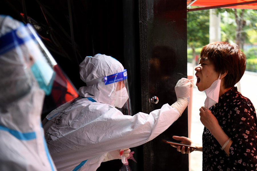 7月3日,在安徽省宿州市泗縣虹城街道東關(guān)社區(qū),醫(yī)務(wù)人員為居民進(jìn)行核酸采樣。