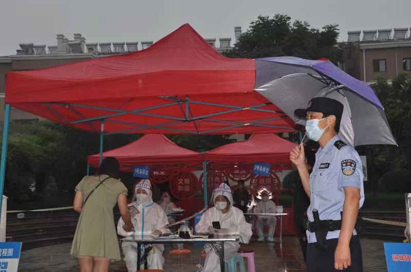 圖為7月5日,故黃派出所民警楊勍在梨都明珠小區(qū)核酸檢測現場冒雨值勤。